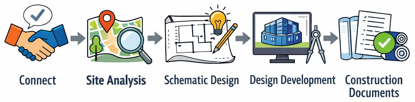 For light commercial build outs often called tenant improvements or TIs, we begin with the building code review. Looking at the overall existing building, where your space is located within that building and what spaces are adjacent to you - fire separations, egress and other critical requirements will be determined and how your space is to be built out.